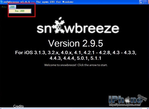 1.打開sn0wbreeze,點擊左上角的“ireb”,選擇“run ireb”,跳轉到IREB引導界面。