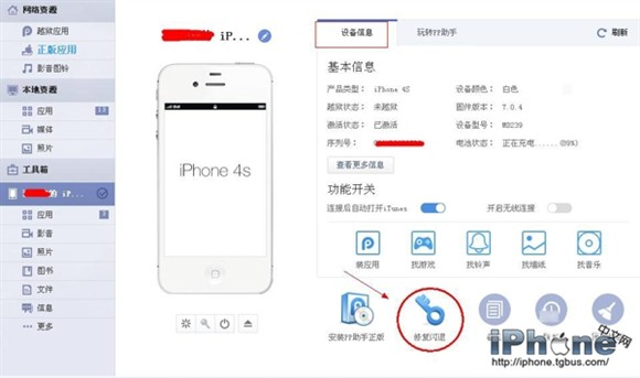 ——將iPhone手機連接上電腦,然後在左邊點擊自己的設備然後右邊選擇“設備信息”選項,在下面我們看到有個修復閃退功能;