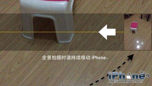 當我們進入全景模式以後,可以看到屏幕上會出現畫中畫,並且還會提示我們在拍攝時請持續移動 iPhone 手機 。點擊底部的”拍照“按鈕,即可開始。