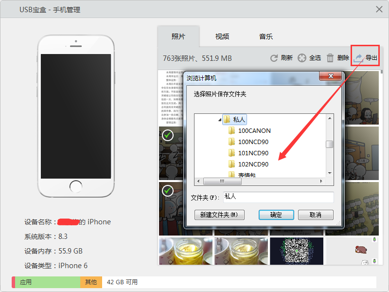 有了USB寶盒,除了一目了然的查看iPhone6裡的圖片、視頻等,還可自行選擇或點擊全選按鈕進行全選,來刪除或導出手機裡的文件(導入功能也即將上線),從手機管理界面左下方,可查看到手機的內存使用情況、系統版本等。
