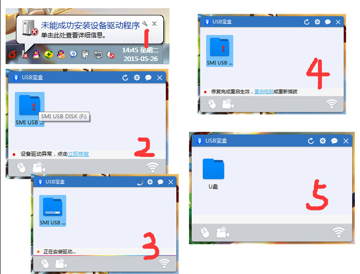 USB寶盒除了可以管理好手機,其他的USB連接問題也不在話下。有時我們電腦插入U盤,桌面右下角會彈出未能成功安裝驅動等提示,這時候就需要安裝相關驅動才可運行你的U盤了。解決方法,打開USB寶盒——雙擊出現如感歎號USB設備進行修復——修復完成重啟電腦或重新插拔設備——完成修復。