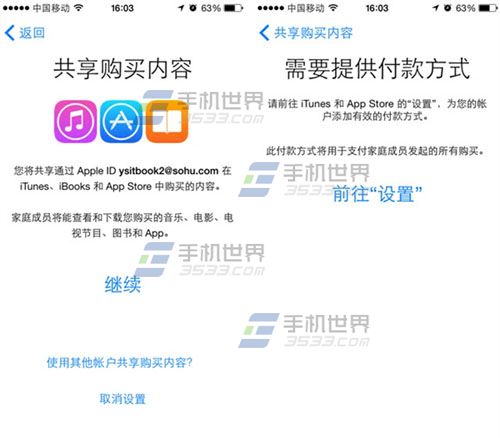 2)點擊【繼續】,如提示【需要提供付款方式】的話,請【前往設置】綁定一張銀行卡。PS:在中國App Store還不能綁定信用卡,所以購買共享還不能用。(如下圖)