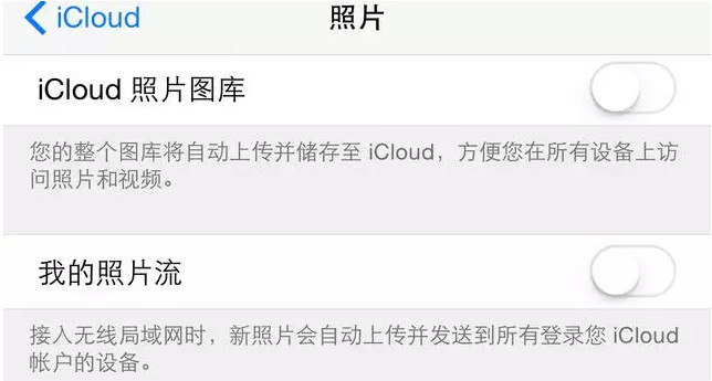 在當下,用手機隨時隨地拍照,已經成為大家的使用手機的習慣之一了。時間一久,自然在手機上會存儲越來越多的照片。如果你當前打開了 iCloud 服務中的“照片流或 iCloud 圖片庫”的話,它會通過無線把當前手機中的照片都上傳到 iCloud 雲端,並且還會在手機上存儲一個相同的副本,這無疑是增加了 iPhone 的存儲壓力。雖然照片流或 iCloud 圖片庫都在同步到 iPhone 上時,都是經驗優化處理過的,但個人建議還是關閉這它們為好,從而為 iPhone 節約一定的存儲空間。如圖所示,個人當前是沒有打開照片流或圖片庫的選項,可以在【設置-iCloud-照片】中檢查。