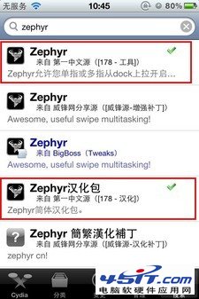 安裝說明:我們前面也提到過,安裝iphone插件的前提是必須要經過越獄。越獄後找到Cydia,運行並在搜索空格內輸入“Zephyr”,這時我們就會在列表中看到Zephyr的相關搜索結果,依次安裝Zephyr及其漢化包即可。(另附技巧:漢化包的選擇上,如若我們選擇了178的插件工具下載源,那麼最好就選用同樣來自178的漢化包,這樣會更加直接有效地對插件內容進行全面漢化。)後面文章中的其他插件安裝方法與這裡相同,可直接引用。