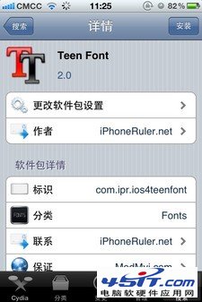 添加BytaFont字體包。在Cydia中搜索“font”,搜索結果裡面圖標顏色為的字體就是Bytafont用的字體,找到自己喜歡的字體下載後,回到桌面,進入Bytafont軟件到Advanced去設置(Original Fonts IOS4.2.1系統字體,先下載這個,恢復系統字體時備用)