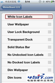 點擊桌面圖標進入操作界面,你將見到有幾個選項在主菜單中。首先,我們選中White Icon Labels,這是Winterboard的自帶默認主題,它只是一個具有簡單的白色圖標標簽的更換程序。