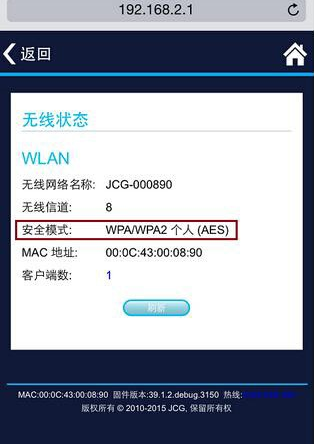 3.在手機設置之前,需要牢記路由器設置的無線名稱和密碼,以及路由器設置的WiFi加密方式。這款JCG無線路由器並沒有顯示采用的是什麼加密方式,但一般情況下都是WPA/WPA2混合加密的。事實上,當我進入“系統信息”-“無線狀態”查看的時候,確實是WPA/WPA2混合加密的安全模式,這也是很多路由器常見的WiFi安全模式。