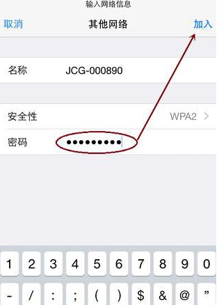 6.接下來輸入正確的WiFi無線網絡密碼,單擊“加入”,iPhone就開始嘗試連接隱藏的WiFi信號了。