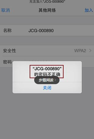 7.如果安全性選擇錯誤或者密碼輸入不正確,iPhone會給出錯誤提示,這樣您需要重新選擇正確的安全性並且輸入正確的WiFi密碼才能再次嘗試連接。