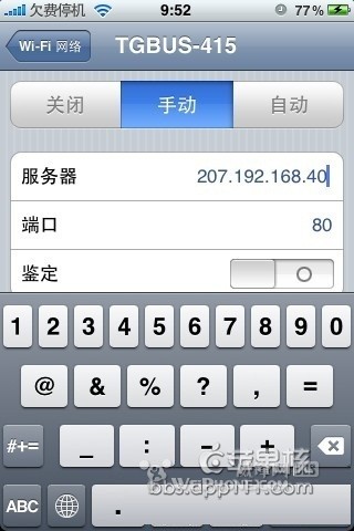 國內用戶可能會感覺到有些國外網站訪問不了,這時候可以設置Da1L1服務器。在AP設置屏幕的最下面有HTTP Proxy(HTTPDa1L1)設置參數,Off表示關閉,Manual表示手動設置,Auto標志自動設置。這裡只講一下手工設置(自動設置一般只有在局域網才能見到,如果要配置,請問局域網管理員)。點擊“手動”,出現如下屏幕:
