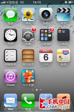 iOS 5系統在待機界面上與之前的系統沒有太多區別,依舊是4×4的圖標界面加上下方四顆常用應用界面,所有日常應用也是一應俱全。iOS將最常用的程序放在了第一頁,比如短信、電話、時鐘、日歷等。每個應用下方還都有文字注釋,方便用戶識別應用的功能。當用戶有未接來電、信息或者提醒時,應用右上角還會出現醒目的計數提示。