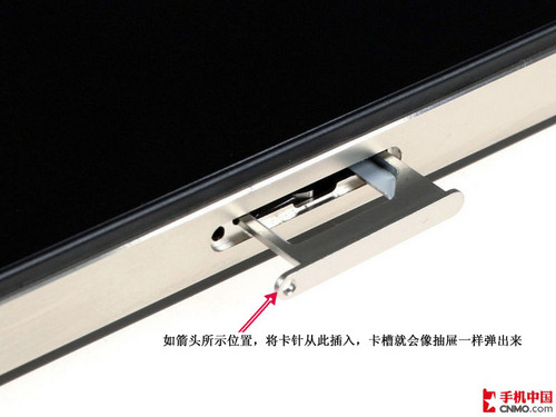 如上圖箭頭所示,用卡針往卡槽的小洞中往裡按,就可以將卡槽頂出來。筆者在此提醒一下大家,如果你用的是剪過的SIM卡,那麼請將卡的尺寸剪好再放進去,如果有毛邊的話請進行修整後再放進去,否則容易造成以後UIM卡槽無法順利彈出的情況,更嚴重的需要拆機才可取出。
