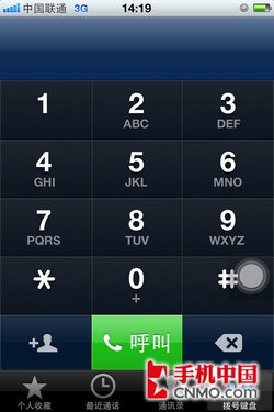 點擊電話圖標便可以進入撥號界面,用戶可以在這裡進行打電話的功能,並且可以查看最近通話。在通訊錄中可以添加常用聯系人到個人收藏,以便快速查找到經常聯系的朋友。另外,Siri是iOS 5新加入的功能,用戶只需按住HOME鍵,屏幕下方就會彈出“What can I help you with?”,在此功能下用戶即可開始人機對話,真正的做到了用語音來控制手機,不過需要注意的是,這項功能需要網絡支持。