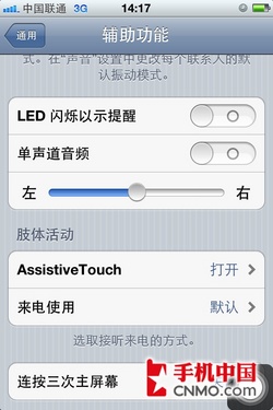 細心的朋友可能會發現上文中手機的屏幕裡總有一個方形的標識,這個是iOS 5新增的功能,在通用——輔助功能中就可以打開。打開後的浮動方塊可以自由移動至屏幕四周,以防止其妨礙日常操作。這個功能方便減少用戶使用物理HOME 鍵的次數,從而在一定程度上解脫了易損壞的HOME鍵,也加強了iOS的手勢操作功能,另手機更智能。