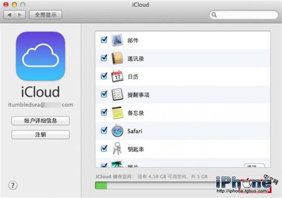 第三步:此時可以看見iCloud設置窗口分為左右兩欄,在右側你可以看見你的iCloud存儲空間的詳情。我們需要點擊右下角的「管理」按鈕。