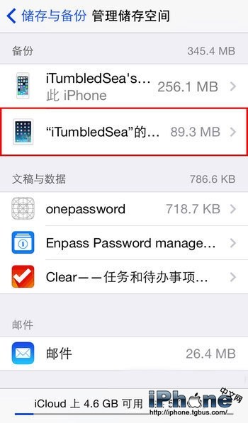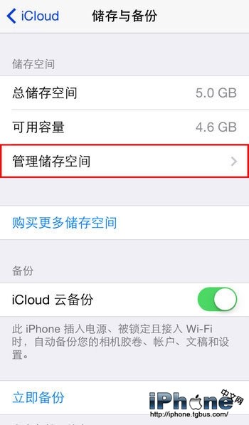 第三步:在「存儲與備份」界面選擇「管理存儲空間」選項。此時你會看到你所有的iCloud備份列表,選擇需要刪除的那個備份文件,點擊它來查看該備份詳情。