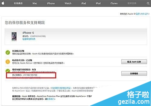 由於iPhone6是從激活日起保修一年的,從圖中,我們可以看到iPhone6 Plus保修到期時間是2016年01月29日 ,如果這這個日期與購入後的激活時間相差一年,就可以判斷屬於正品行貨新機。