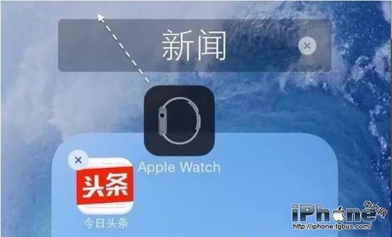 【第三步】文件夾形成以後,把 Apple Watch 應用圖標向屏幕頂部移動,挪出當前這個文件夾。同樣要按住不能松手。