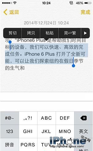 在任意應用中輸入一段文字,比如iOS8的備忘錄應用。完成輸入後,長按字體出現編輯功能,我們可以通過移動大頭針完成文字選擇,這時可以看到編輯工具條上出現了“簡繁”切換功能。選擇該功能後,文字自動切換成繁體字,可以注意到我們的“們”字。