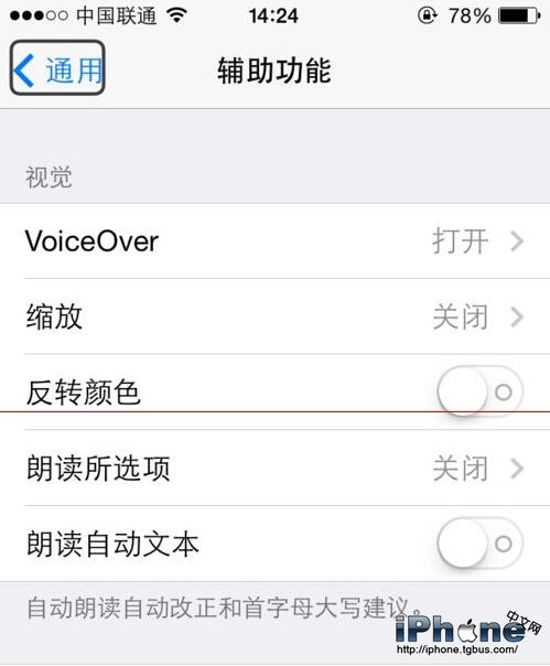 6、打開這個輔助功能快捷鍵(VoiceOver)就會出現下面的界面把第一個選項勾選上就可以了下次連按三次主屏幕按鍵就會出現這個功能再按三次就取消這個功能。