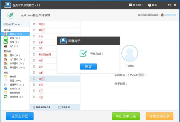 6、然後,我們在需要恢復的聯系人下面的方框進行勾選,然後導出,我們的蘋果手機通訊錄怎麼備份就完美解決了。