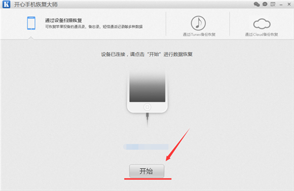 第三步:開心手機恢復大師有三種恢復方式分別是:“通過設備掃描恢復”,“通過iTunes備份恢復”和“通過iCloud備份恢復”;當你運行軟件之後會發現軟件默認的恢復方式是第一模式通過設備掃描恢復,所以當手機連接成功之後,我們就可以點擊下方的“開始”按鈕繼續了;