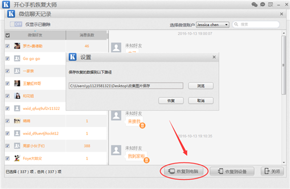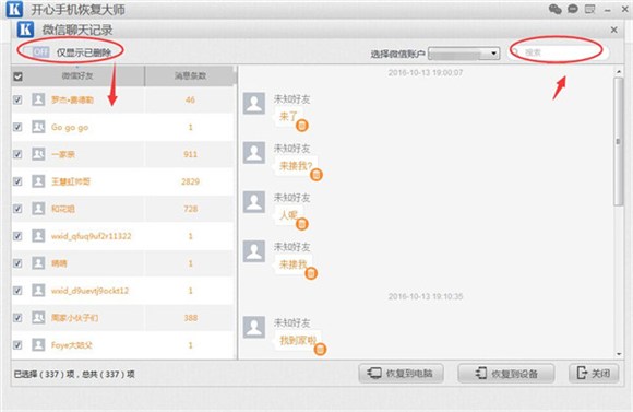 第六步:在軟件界面右上角還有一個搜索欄,我們可以輸入關鍵字查找想要恢復的微信聊天記錄,這樣可以更快的定位到數據,減少時間,最後查看到已刪除的微信聊天記錄之後,只要將這部分數據記錄進行勾選,然後點擊“恢復到電腦”,就可以將這些微信聊天記錄恢復到電腦上進行保存查看了。