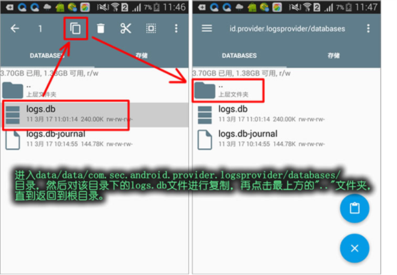 (2)進入到“data/data/com.sec.android.provider.logsprovider/databases/”目錄,長按該目錄下的logs.db文件對其進行選擇。