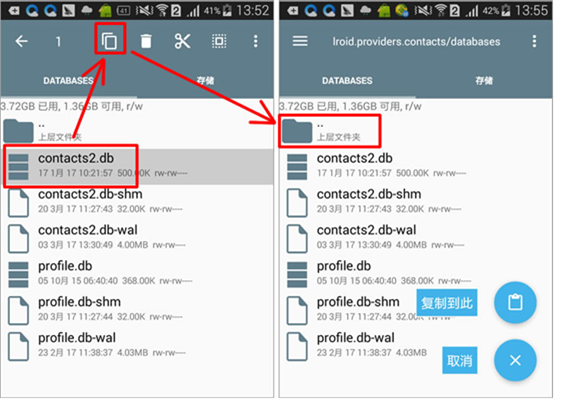 (2)然後長按該目錄下的contacts2.db文件對其進行選擇,然後點擊上方的復制圖標對其進行復制。復制後,請點擊“..”圖標返回上層目錄,直到返回到根目錄。