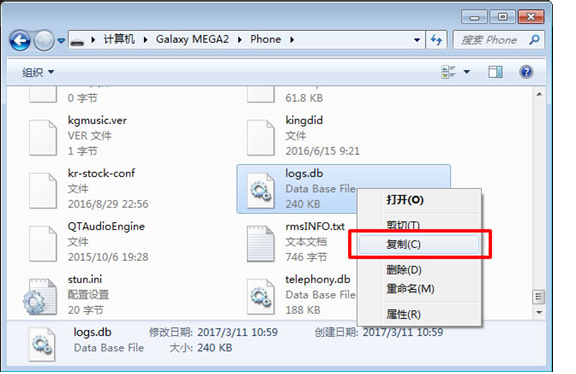 (2)然後對手機根目錄下的logs.db(或contacts2.db)文件進行復制,並將其粘貼到電腦上任意目錄下。