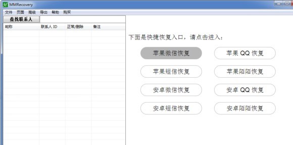 接下來就不需要手機了可以拔掉了,首先運行恢復工具MMRecovery,如下圖在右側快捷恢復入口,點擊 “蘋果微信恢復 ”按鈕,將會彈出“微信恢復向導”對話框。