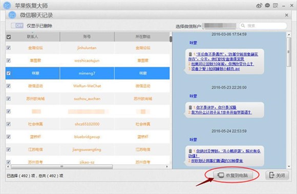 第五步、掃描結束之後預覽到結果,其中刪除的微信聊天記錄系統會用橙色字體進行標注,如果數據比較多,我們可以在右上角輸入關鍵詞進行快速檢索;勾選部分需要恢復的蘋果手機微信聊天記錄,點擊【恢復到電腦】即可將微信聊天記錄導出到電腦本地。