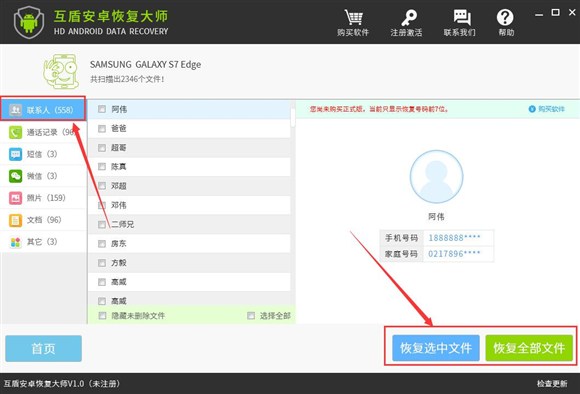 5、等待軟件掃描完成,我們可以點擊軟件左側的“聯系人”選項查看手機裡的聯系人,我們勾選出自己想要恢復的聯系人,點擊“恢復選中文件”進行恢復,或者點擊“恢復全部文件”恢復所以聯系人。