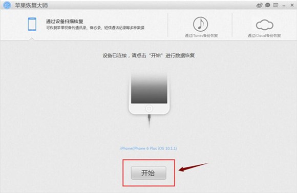 第三步、運行蘋果恢復大師,使用默認的第一模式來恢復蘋果手機中刪除的微信聊天記錄,所以當界面上顯示“設備已連接”,表示軟件識別到了設備,點擊【開始】繼續;