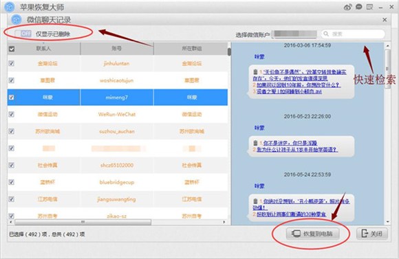 第六步、掃描結束可以預覽到結果,點擊【僅顯示已刪除】即可看到全部已刪除的微信聊天記錄,勾選部分需要恢復的微信文字記錄之後,點擊【恢復到電腦】將蘋果手機已刪除的微信記錄備份到電腦本地,點擊【浏覽】可以更換保存路徑。