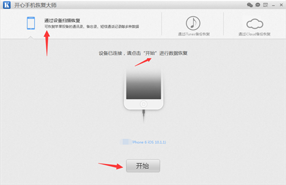 第二步: 運行開心手機恢復大師,我們點擊選擇“通過設備掃描恢復”,以此模式為例,教大家如何恢復微信刪除的聊天記錄。將自己的蘋果手機通過蘋果數據線連接到電腦,如果是蘋果設備首次連接電腦,需要在蘋果設備上點擊“信任”。然後等待開心手機恢復大師讀取識別iPhone手機,識別完成後,會顯示設備名稱信息。然後我們點擊“通過設備掃描恢復”,隨後點擊“開始”。
