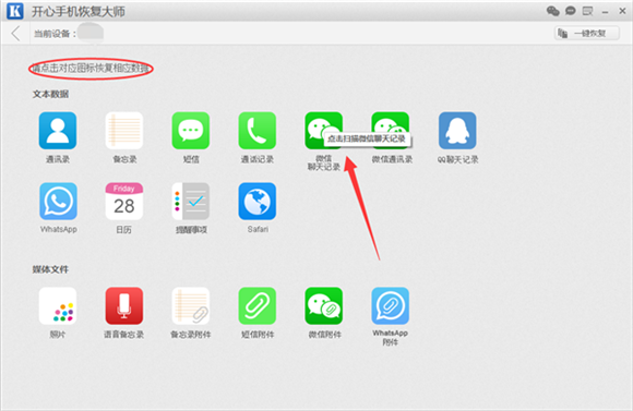 第三步: 點擊“開始”後,我們會看到恢復數據的主界面。主界面上顯示的“微信聊天記錄,通訊錄,備忘錄,短信,照片,語音備忘錄等”許多蘋果數據圖標的數據均支持恢復。我們要恢復微信刪除的微信聊天記錄,所以我們找到“微信聊天記錄”圖標,然後點擊圖標,軟件開始掃描iPhone設備中的微信聊天記錄。