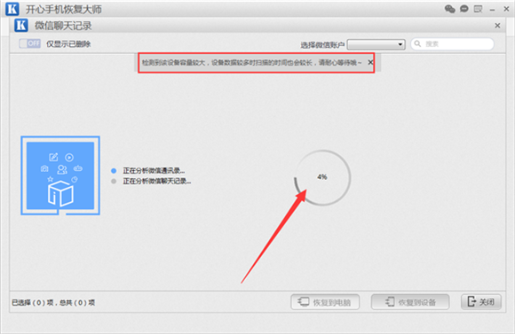 第四步: 掃描微信聊天記錄需要一定的時間,具體的時間根據手機空間使用情況而定。掃描階段是恢復蘋果手機微信聊天記錄最重要的一步,所以此階段不要對手機進行操作,避免對掃描過程的影響。