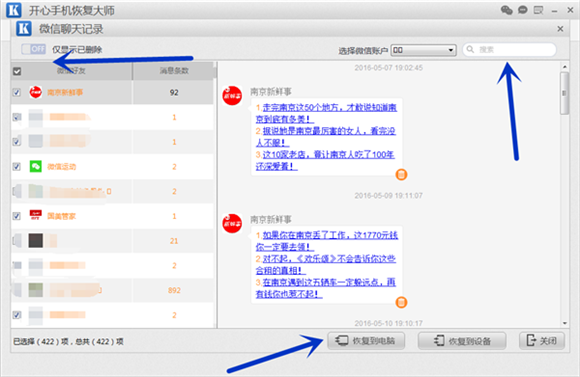 第五步: 掃描完成後,會跳轉到微信聊天記錄的預覽界面。左側是微信好友信息,右側是與好友的聊天記錄。微信聊天記錄以兩種顏色顯示:橘黃的表示刪除的微信聊天記錄;黑色的表示未刪除還在手機上的微信聊天記錄。微信聊天記錄刪除了怎麼恢復?我們可以點擊左上角的“僅顯示已刪除”或者在右上角搜索微信聊天記錄,查找到要恢復的微信聊天記錄,左側方框勾選,然後點擊“恢復到電腦”即可恢復微信刪除的聊天記錄。