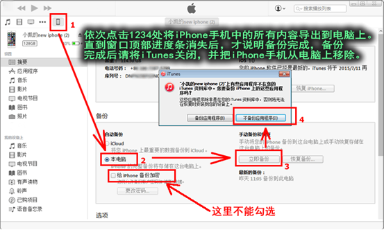 2,接著請在百度上搜索下載iTunes軟件,安裝完成後,請打開該軟件,並使用該軟件對iPhone手機上的所有文件進行備份,具體備份操作的步驟請看下圖說明。