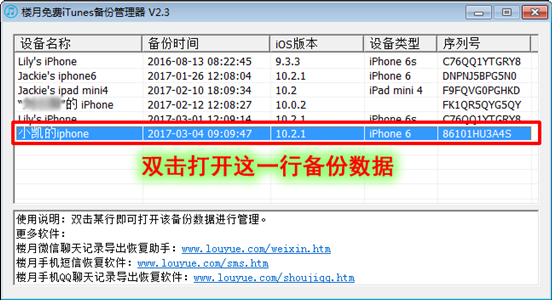 3,iPhone手機上的所有文件都備份到電腦後,接著請在電腦上安裝並打開“樓月免費iTunes備份管理器”軟件,該軟件是一款管理iPhone備份數據的軟件,可以使用該軟件提取出手機上的任意文件或文件夾。打開該軟件後,我們雙擊打開最下面那一行備份數據。