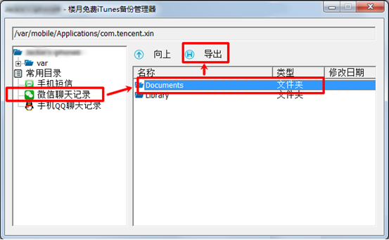 4,接下來點擊左邊的微信聊天記錄,在右邊我們通常可以看到Documents和Library兩個文件夾,我們將Documents文件夾導出到電腦上,因為與所有好友的微信聊天內容就保存在該文件夾中。