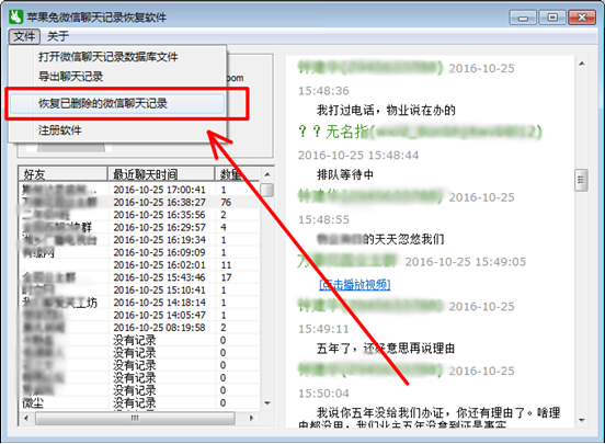 6,在電腦上解密查看iPhone手機上的微信聊天記錄的功能就實現了,我們接著點擊下圖所示恢復菜單對iPhone手機上不小心刪除的微信聊天記錄進行恢復。