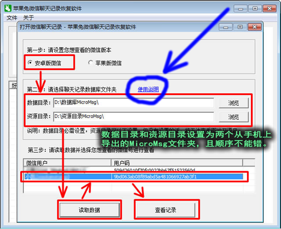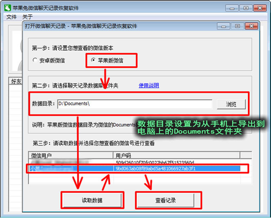 5,接下來請下載並打開“蘋果兔微信聊天記錄恢復軟件”,設置界面一目了然,只需要認真查看上面各選項前面的說明就知道如何設置了,讀取數據後,請選擇一個想查看及恢復微信聊天記錄的微信號進行查看記錄。