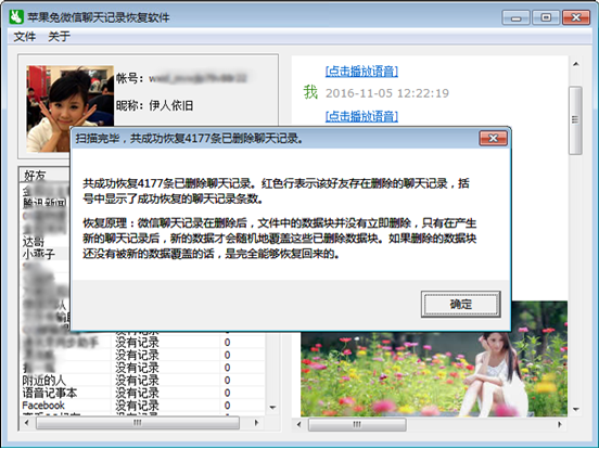 7,終於到了收獲的季節了(出結果的時候了),軟件在有條不紊地對殘留數據修復及還原後,小編在自己的蘋果手機上成功找回了四千余條刪除的微信聊天記錄。