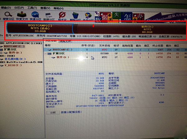 根據你自己的需要對硬盤進行分區,格式建議還是選擇NTFS格式,以後會省去很多的麻煩!由於我的是120的AIR,所以我只是分了兩個區,一個33,一個80,如果你是500的MACBOOK PRO,那就可以多分兩個區了。