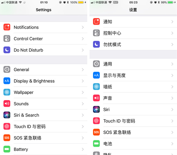 這次,首先蘋果將上一個版本漢化中文 bug 修復,整體回到了正常狀態。左圖為 iOS 11 Beta 3,右圖是 iOS 11 Beta 4。
