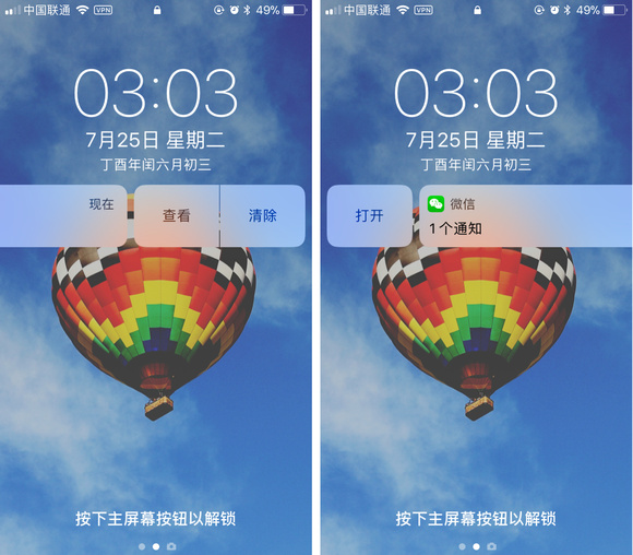 這次最大的改變是摒棄 iOS 11 Beta 3 之前做的鎖屏界面下長摁提醒內容打開應用程序的消息操作重新回歸到 iOS 10 上左右滑的過程。
