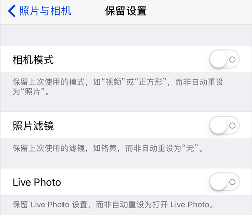 現在你可以在「設置 - 照片與相機」中看到一個新增的「保留設置」選項,點擊進入後可以看到相機模式、照片濾鏡和 Live Photo 開關,默認是關閉的。當保留設置開啟之後,相機應用會記住你上次拍照的模式,包括上次選擇的照片、視頻、正方形、濾鏡和 Live Photo 等,更為人性化了。