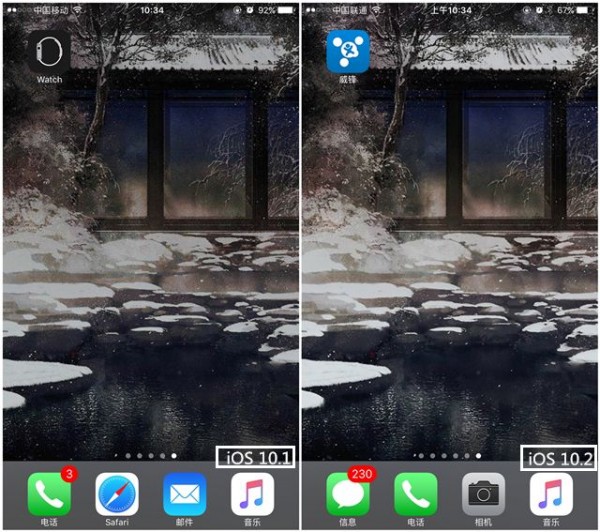 此前 iOS 10 的主屏壁紙會自動加上一層毛玻璃效果,讓壁紙顯得比較暗。iOS 10.2 則把這層效果的透明度進行了調整,讓壁紙恢復了正常的亮度。